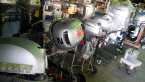 弊社の修理用スタンドに全部に船外機が引っかかる恒例の風景は壮絶絶景です。